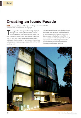 Script's iconic facade continues to capture the attention. Being the Flagship store, the intention was to create an Iconic design that provides a dramatic feel at different hours of the day. For this, and as a solution to battle the solar heating of the west-facing store, kinetically operated louvres were devised. These louvres were perforated to behave like a jalli that helped to cut the sunlight. The perforations varied in diameter to create a visual effect that exhibits the mnemonic patterns of the brand. It was ensured that the brand identity flows all the way from the façade to the entrance porch below. The porch ceiling was also made with perforated metal panels that were backlit and had the same mnemonic brand patterns. These patterns changed colour by the usage of transitional RGB lighting to catch the attention of the people. This iconic facade was recently featured in MGS Architecture September 2018 edition!